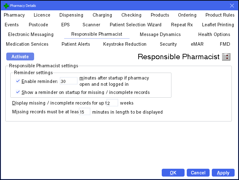 - Enable reminder - Tick to activate a reminder if the responsible pharmacist has not logged in.