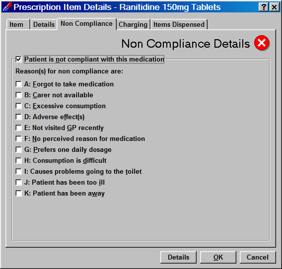 A common feature at the bottom of these tabs is the Details button which, when clicked, will provide more information about the dispensed item.