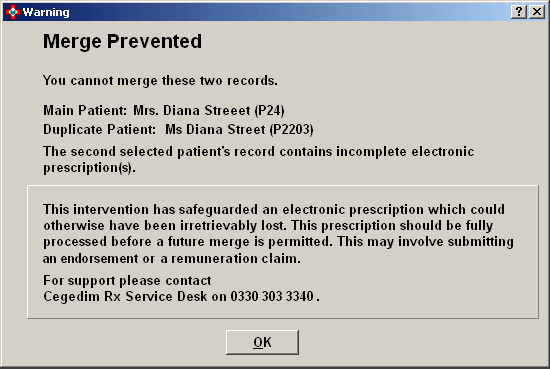When you attempt to undertake such a merge, the system will intervene, safeguarding an electronic prescription which otherwise would have been irretrievably lost along with your ability to submit a successful reimbursement claim.