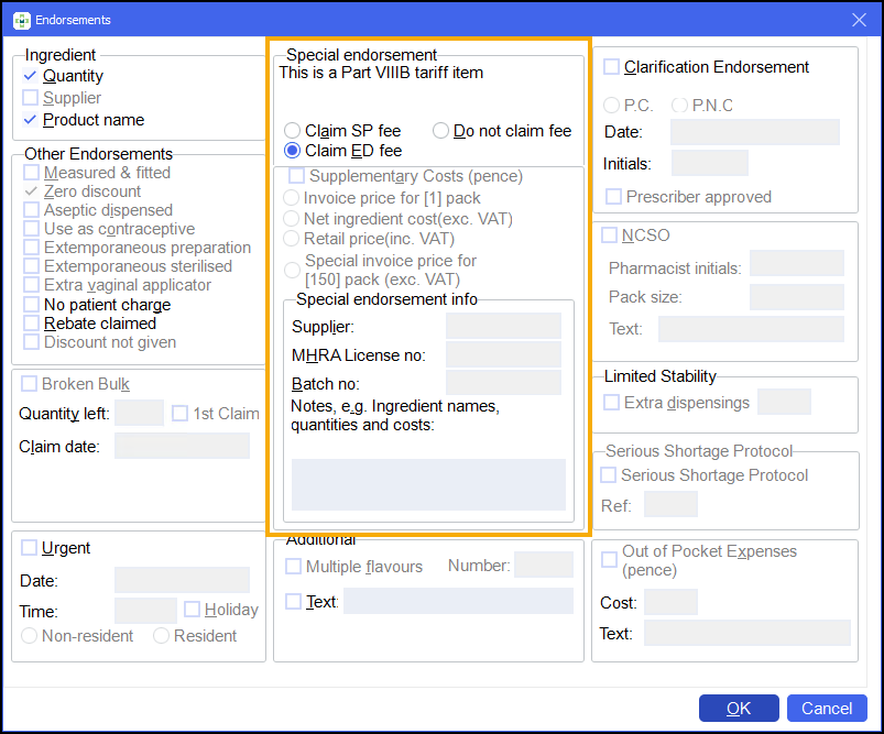 If you have the Special items setting in Pharmacy Details - Dispensing - Endorsing set the system to Always make me choose, select the SP or ED endorsement according to how your specials supplier has manufactured the product: