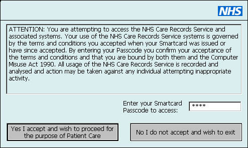 Click the button showing Yes I accept and wish to proceed for the purpose of Patient Care to confirm.