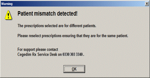 An alert appears if you try to process multiple prescriptions that are for different patients.