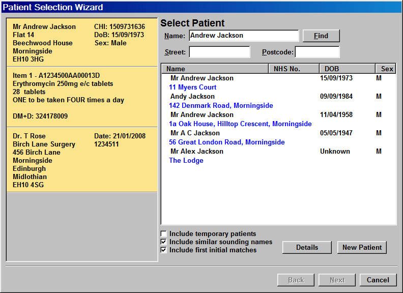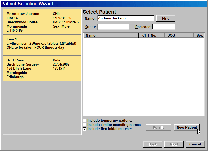 The Patient Selection Wizard screen is displayed but is empty as no patients with the same initial/surname combination are found.