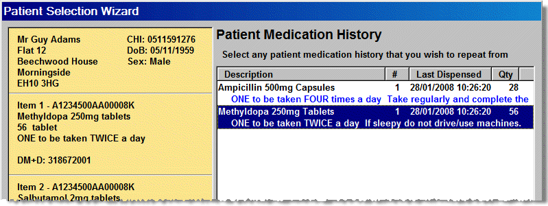 Electronic prescriptions have the advantage of being quickly processed in Pharmacy Manager. The repeat process outlined above can further speed up dispensing and labelling which may suit your pharmacy workflow. However, if you prefer, and option exists for you to suppress the medication history display step (which in turn disables repeating for eAMS prescriptions) in the Patient selection wizard.