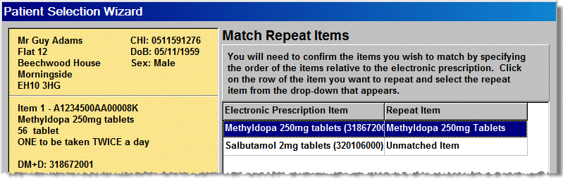 Items that have previously been prescribed against the particular DM+D code in the electronic prescription will be automatically matched.
