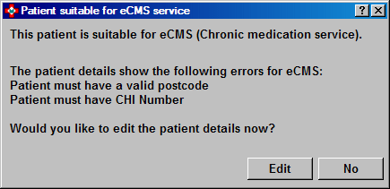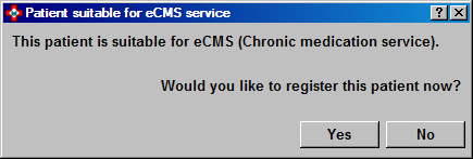 Furthermore, you can update a patient record whilst dispensing to indicate they are suitable for eCMS. You are then offered the immediate option to register the patient.