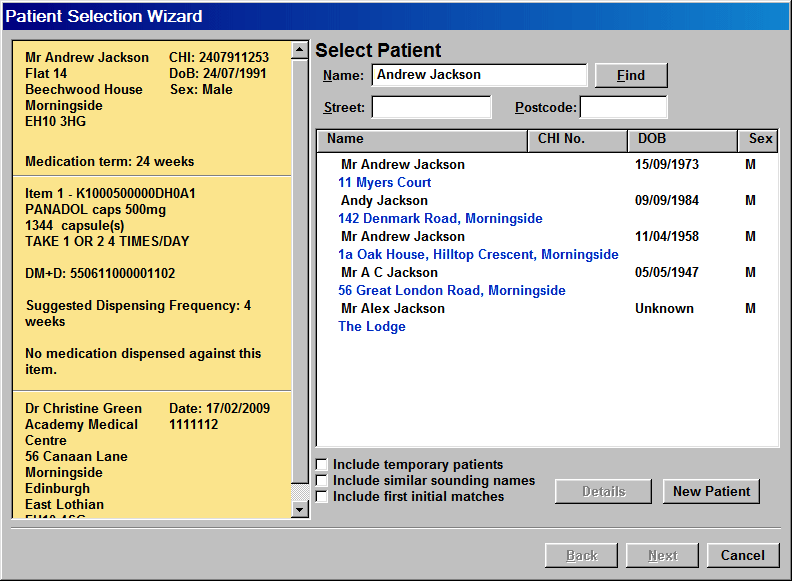 The Patient Selection Wizard screen is displayed but is empty as no patients with the same initial/surname combination are found.