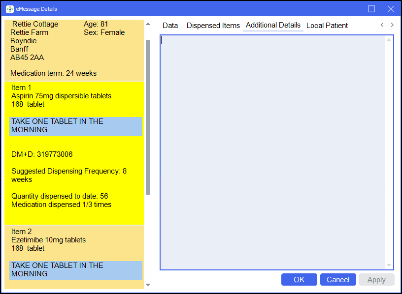 The eMessage Details screen displays all the details relating to an electronic prescription.