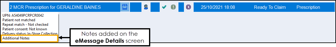 Notes - Space for you to include any notes about the patient or prescription. If a note is attached to a prescription it will appear as a pop-up if you hover over the prescription on the eMessages tab: