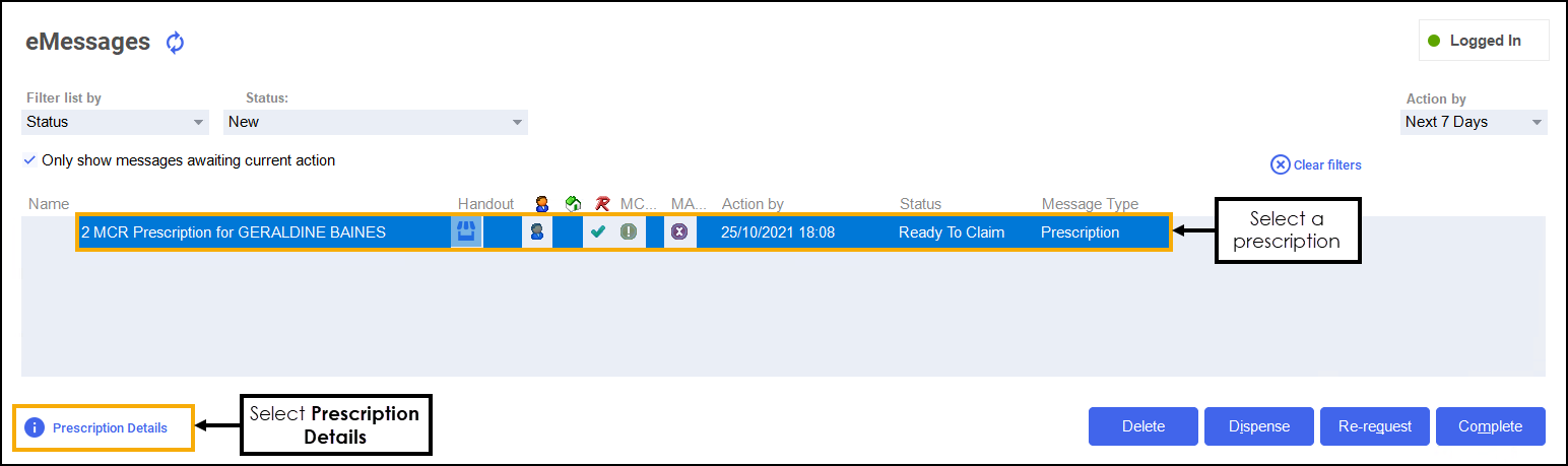 Status - Duplicates what displays in the eMessages screen Status column. Displays the current status of the prescription, for example, New, Ready To Claim or Claimed.