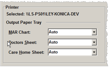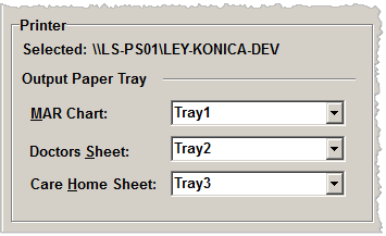 For example, you could use white paper in Tray1 for the MAR Chart. You could use yellow paper in Tray2 for the Doctor's sheet and pink paper in Tray3 for the Carehome's record sheet.
