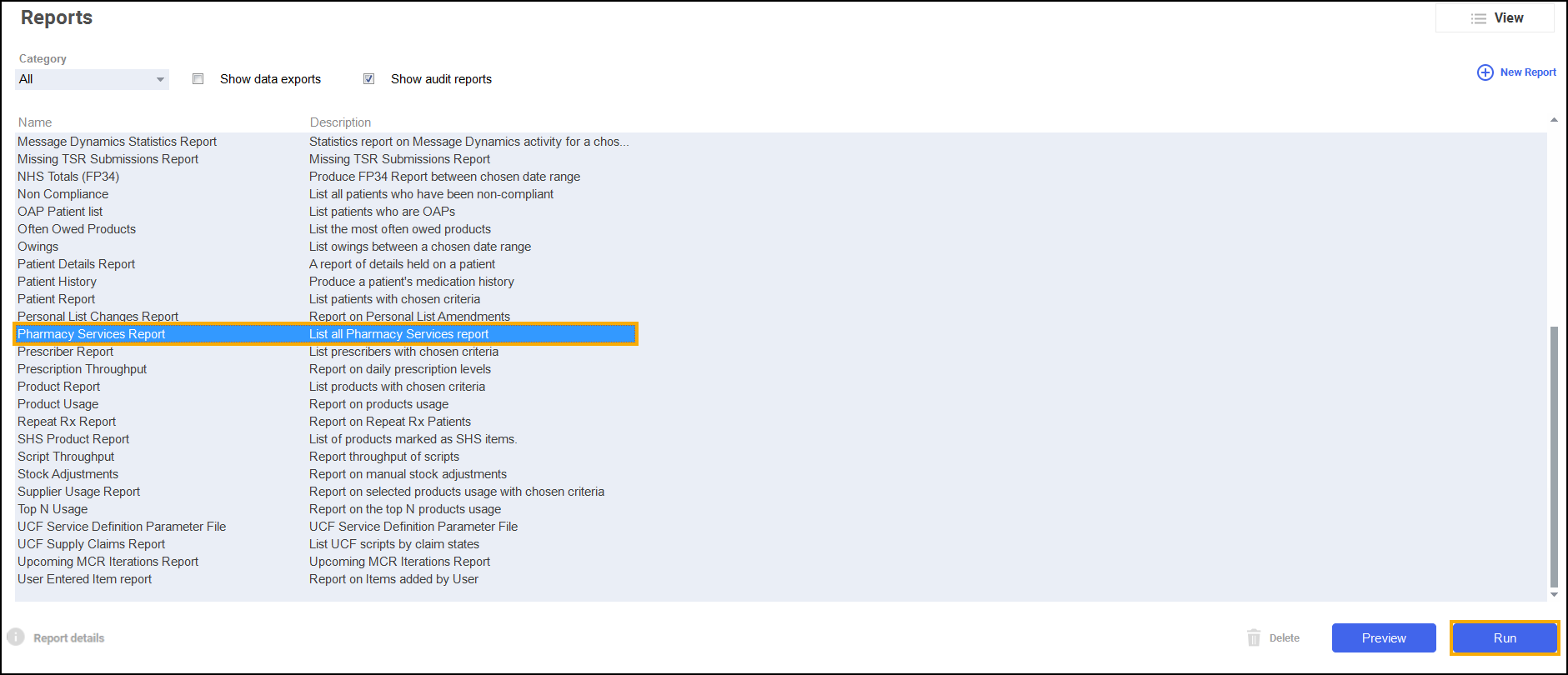 From the list of available reports, select Pharmacy Services Report and select Run: