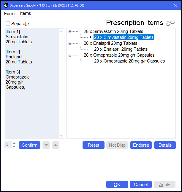 - Once a prescription is complete, providing you have set the Endorsement printing option to Always in User Details, the Dispensary Supply screen displays: