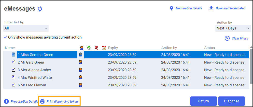 Note - To print a dispensing token for a patient that has multiple prescriptions to be dispensed, sort by name, press and hold Ctrl on your keyboard and highlight each prescription, finally select Print dispensing token.