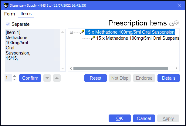 . - The Dispensary Supply screen displays. Check the endorsement details are correct for the item and select Confirm