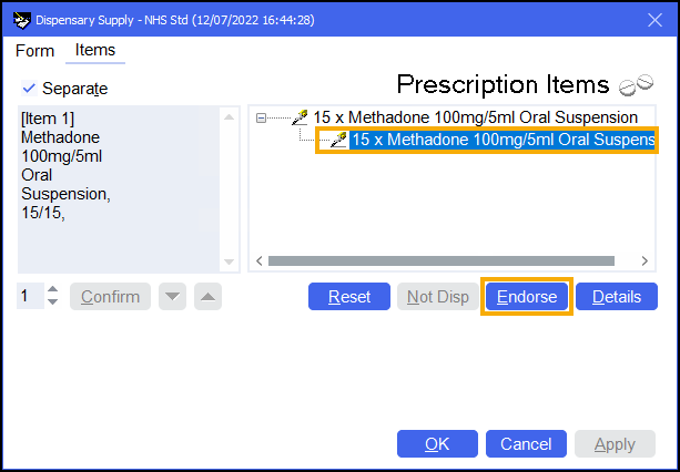 The Dispensary Supply screen displays, check the endorsement details are correct and select OK