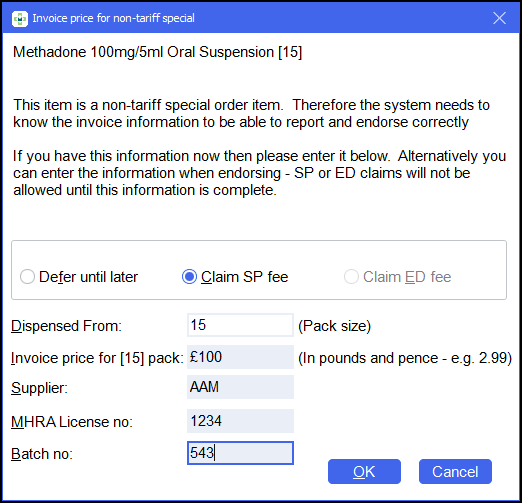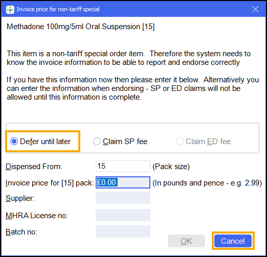 Note - If you do not have the above information, select Cancel and continue to dispense as normal. - Select OK