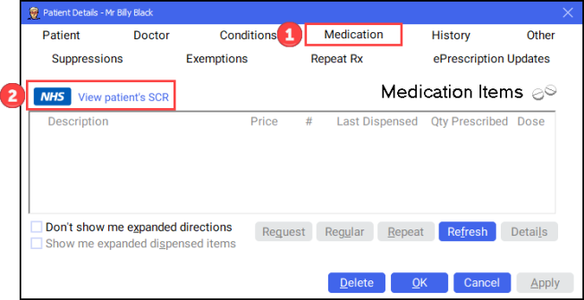 - The Patient Details screen displays, select the Medication tab and select View patient’s SCR
