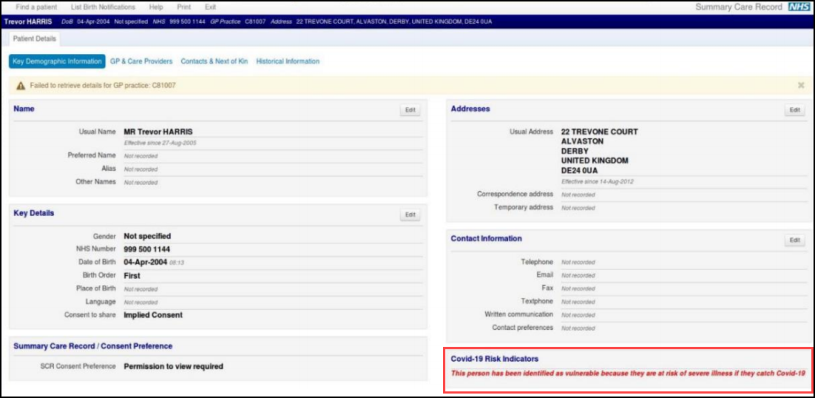 - If the patient is on the on the COVID 19 shielded patient list, the Covid -19 indicator flags are present screen displays. Select OK to access the patient's SCR.