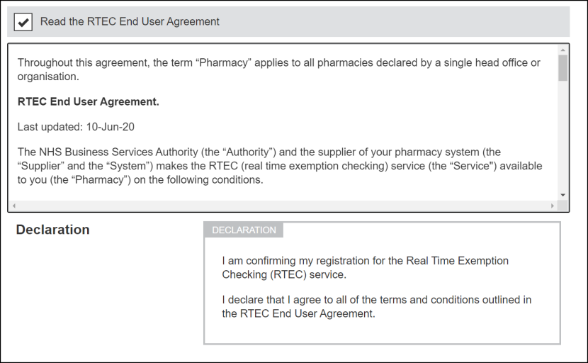 The RTEC Declaration screen displays. Select the Read RTEC End User Agreement checkbox: