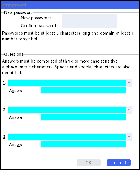 - Questions 1 - 3 - Select a question from each list and then enter an answer. These are for use if you forget your password, so they should be things you can remember and do not change.
