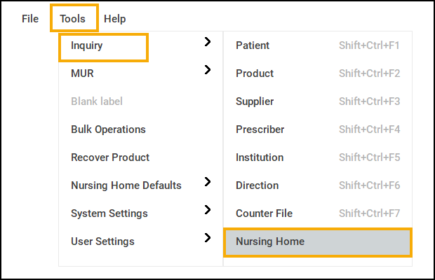 Select Tools - Inquiry - Nursing Home to open the Find Institution screen: