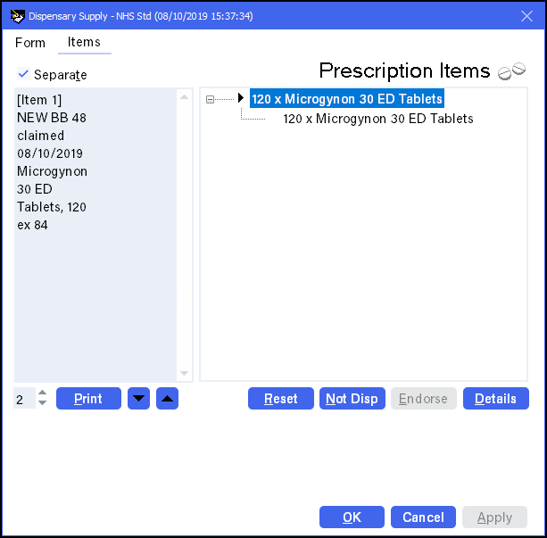 - Once a prescription is complete, providing you have set the Endorsement printing option to Always in User Details, the Dispensary Supply screen displays: