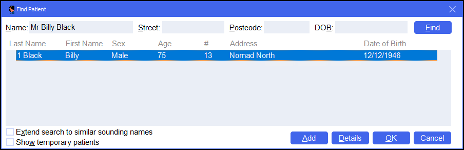 Training Tip - You can also search for a patient by entering their NHS/CHI number prefixed by #, for example, #0123456789.Training Tip - Leave Patient blank to search by address or date of birth.