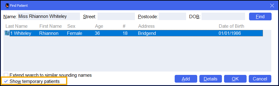 To include temporary patients on the Find Patient screen, simply place a tick next to Show temporary patients: