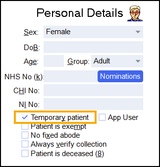 To add a temporary patient, place a tick next to Temporary patient on the Patient Details - Patient screen:
