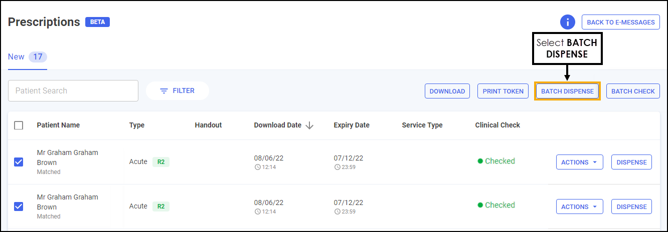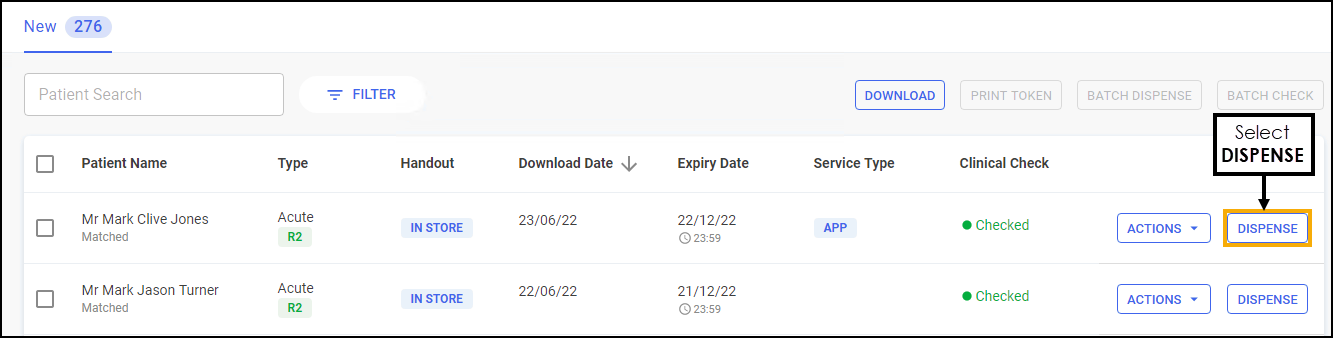 Select the prescriptions to dispense, either select individually or select the column to select all: