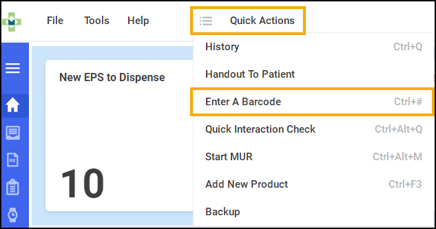 From the Pharmacy Manager Toolbar select Quick Actions - Enter A Barcode:
