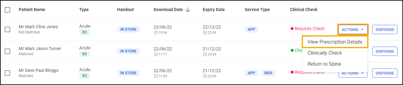 To the right of the unmatched prescription, select ACTIONS and then View Prescription Details: