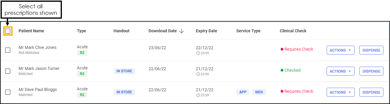 Select All - Select all prescriptions on the page.