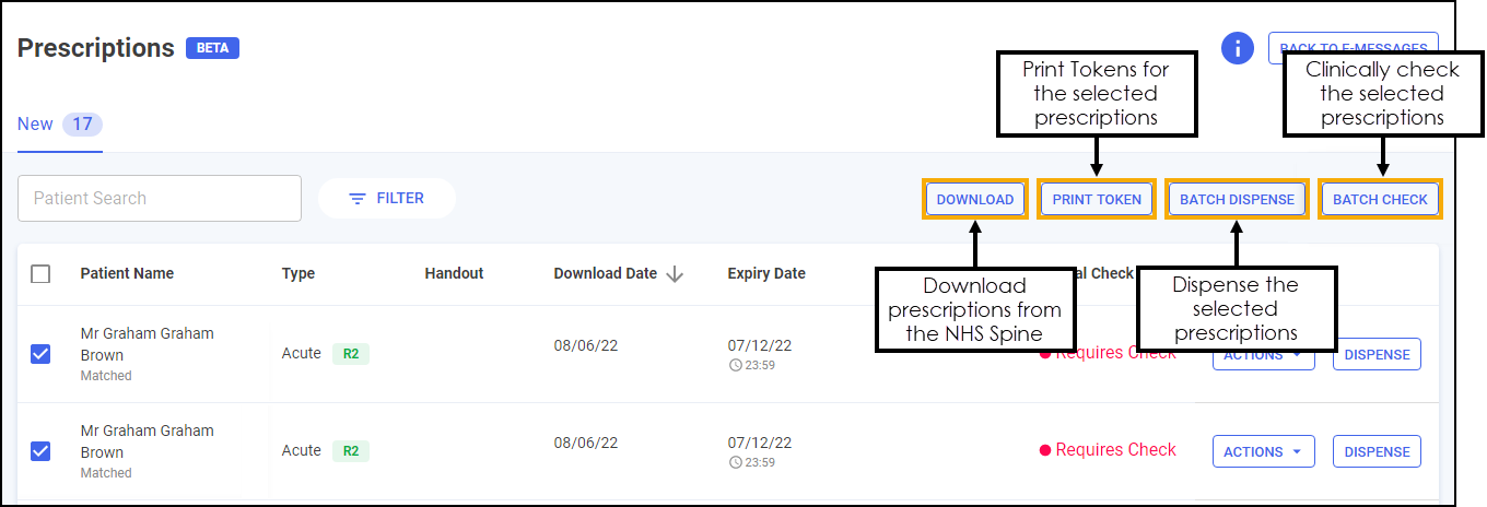 The new Prescriptions screen displays all new EPS prescriptions that are ready to dispense and require action. You can easily search, sort and filter the prescriptions to manage your workload effectively, see Searching for, Sorting and Filtering Prescriptions for more details.