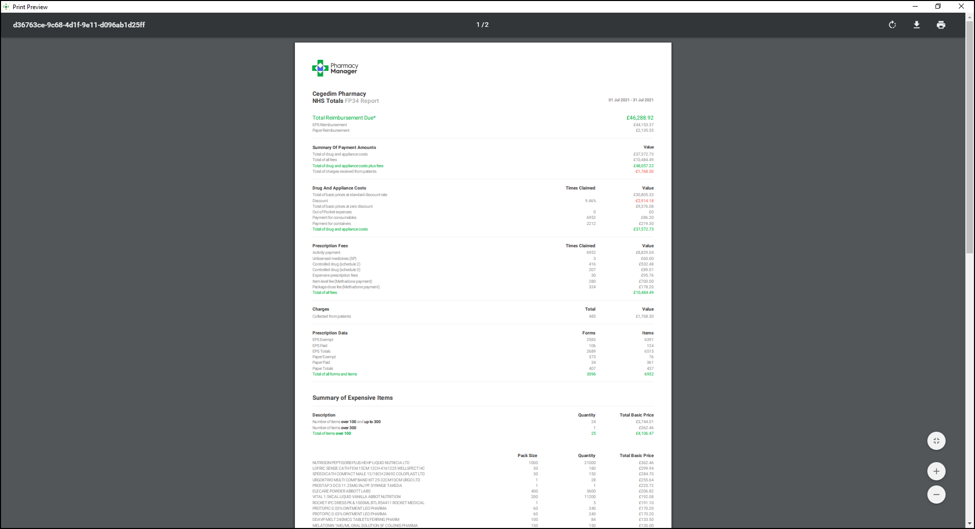 The FP34 report displays a detailed breakdown of the Total Reimbursement (see note below) you should expect based on the values claimed over the selected date range. The report captures Drug and Appliance costs, Prescription Fees, charges collected from patients, your prescription totals data and provides a summary of your expensive items.