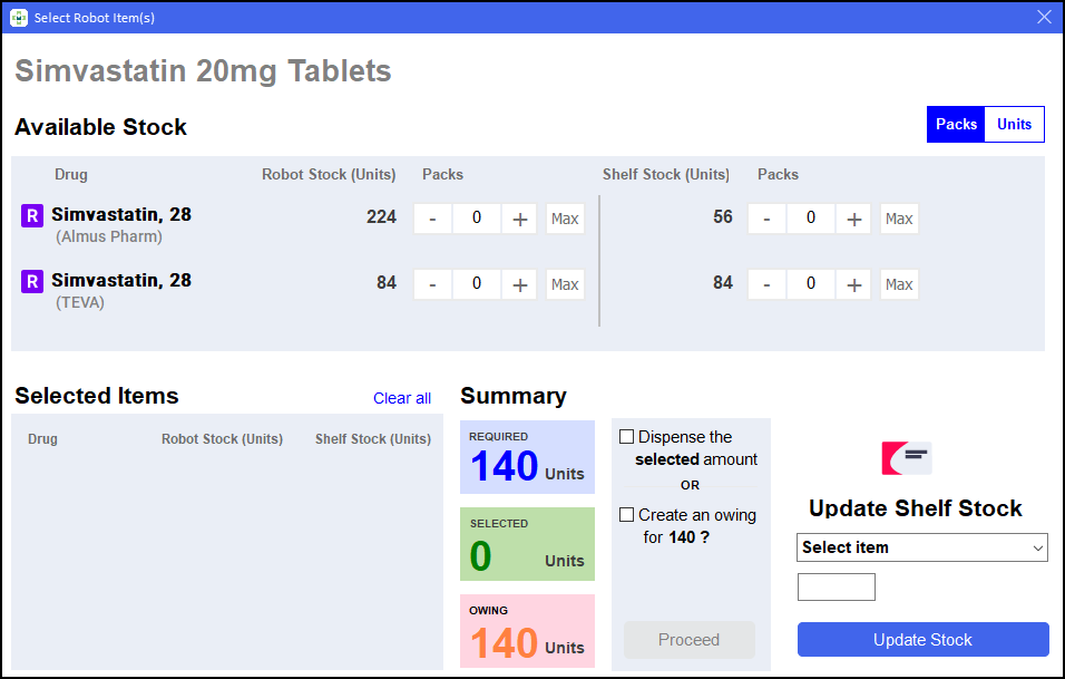 If Qualified stock adjustments is enabled, you are prompted to record a stock adjustment reason when updating shelf stock from the Select Robot items screen: