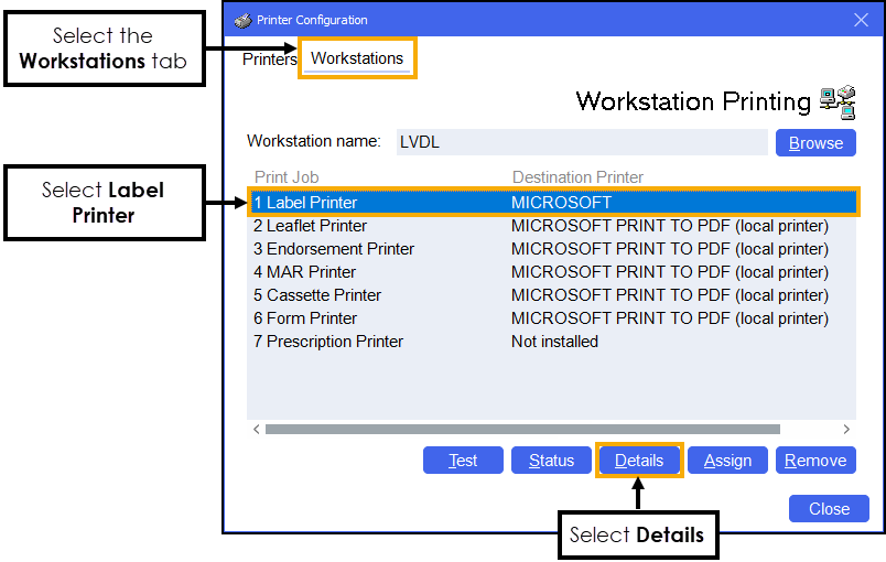 The Printer Details screen displays for the selected Label Printer, see the recommended settings below: