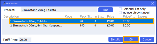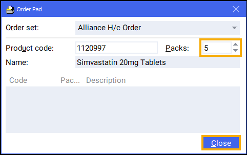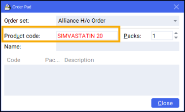 and the Order Pad screen displays. Enter the Product code, for example, SIMVASTATIN 20, and press Enter on your keyboard:
