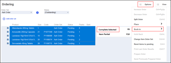 Select the items you have received. Select Options, Book in and Complete Selected.