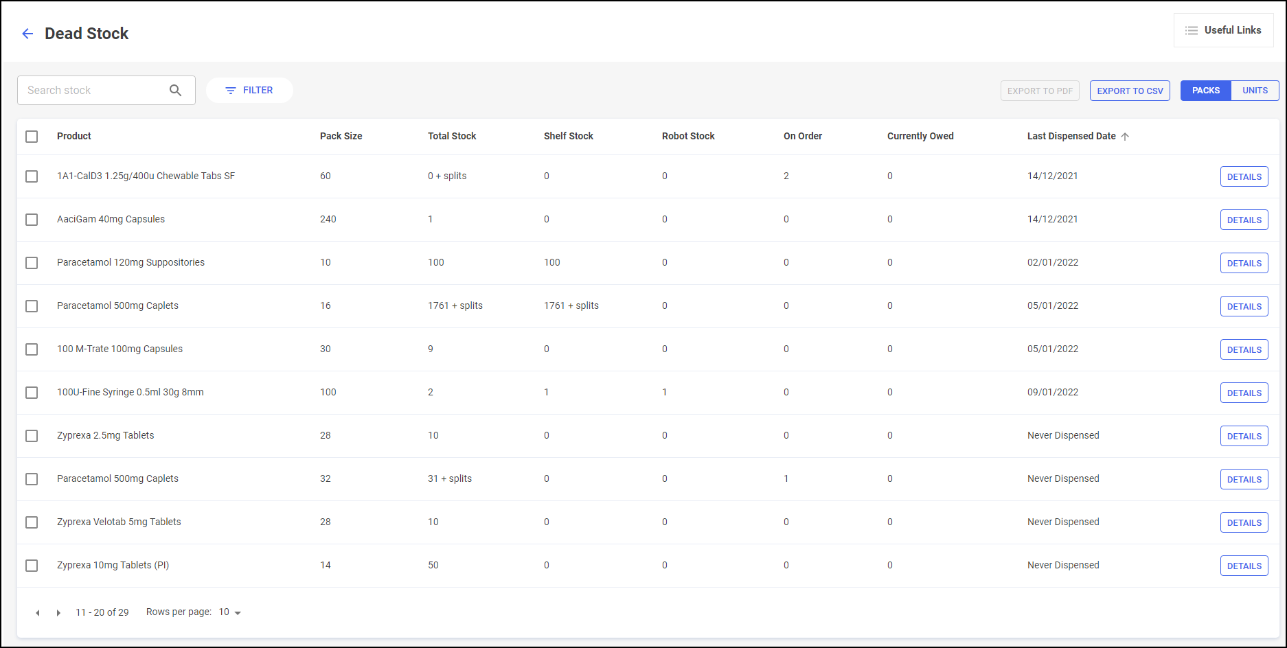 This displays a real-time count of the number of products within the pharmacy that are deemed dead stock. This is calculated based on items that are in stock within the pharmacy but have not been dispensed within a set number of days: