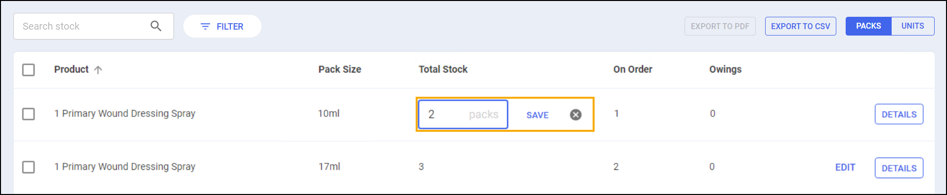 The editable stock items display with a blue box surrounding it. Enter the correct stock number and select Save