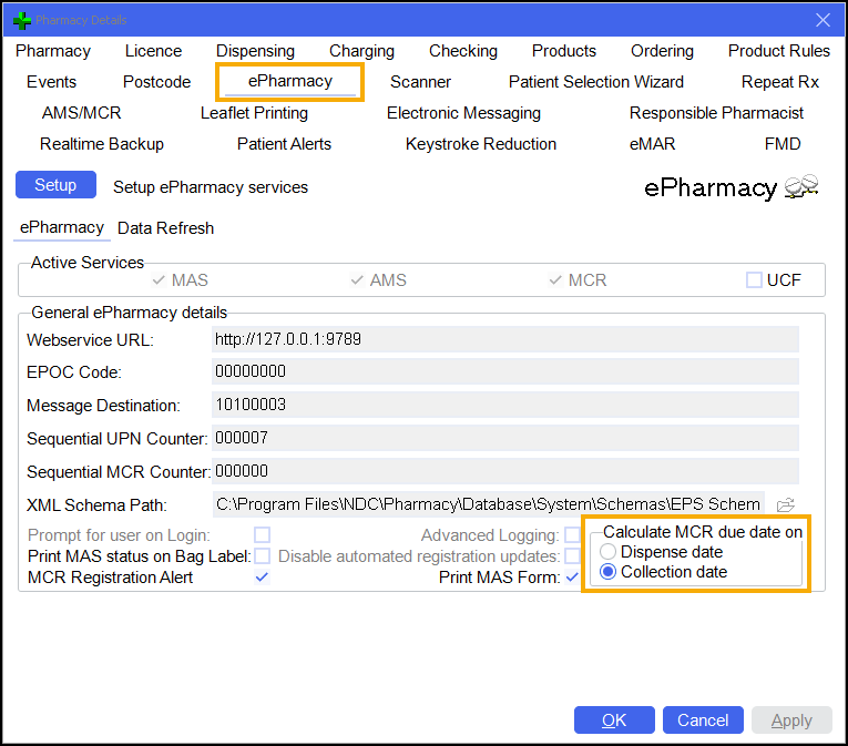 Collection date - The MCR is calculated based on the previous collected date. For prescriptions that have been dispensed but not collected, the MCR due date is calculated on the dispense date and then updates once the prescription is collected.
