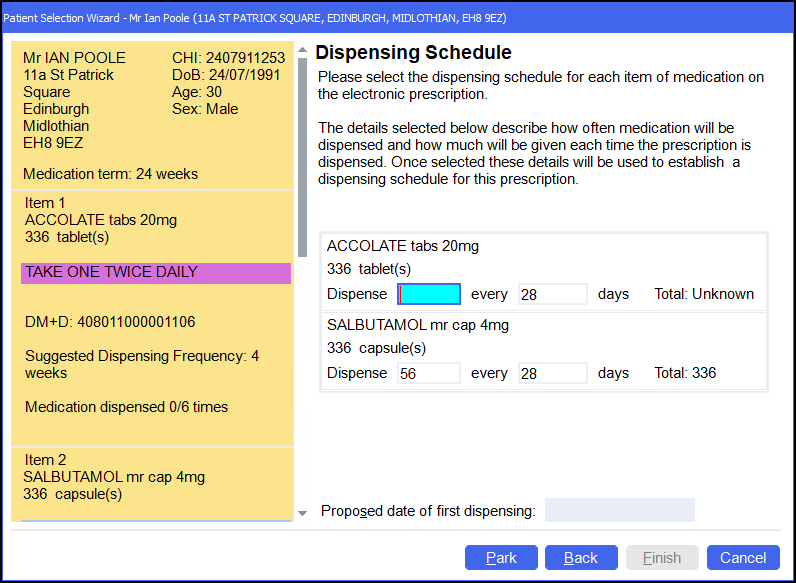 When dispensing the first iteration of a Serial (MCR) Prescription you must confirm the dispensing schedule. The dispensing schedule indicates the quantity of medication and the frequency at which it is due to be dispensed to the patient.