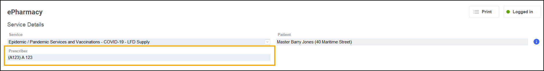Note - Prescriber displays your ePharmacy login details.