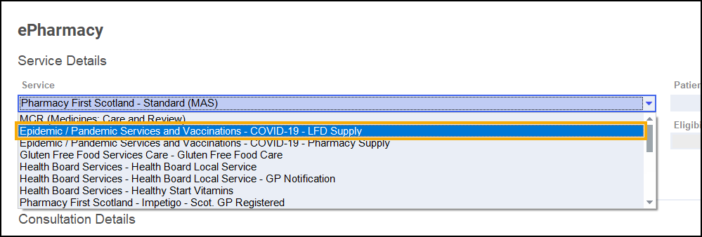 in order to record a UCF consultation, see Logging in to ePharmacy for details. - From Service, select the service you require: