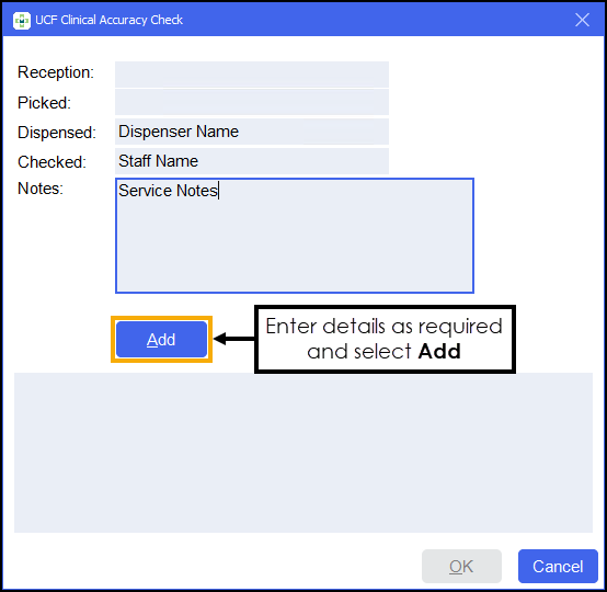 The UCF Clinical Accuracy Check screen displays. Enter relevant text in the boxes as required. This may be a record of the staff member who carried out a particular stage, notes about the suitability of the medication provided as part of the service or the appropriateness of the quantity and its dose frequency for the patient: