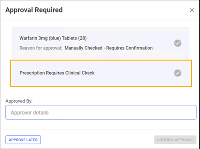 • Enable Clinical Check Warnings - Select this option to display a warning when completing an Accuracy Check if a Clinical Check has not been performed for any prescriptions under review. You must complete the Approved By section before continuing with the Accuracy Check.
