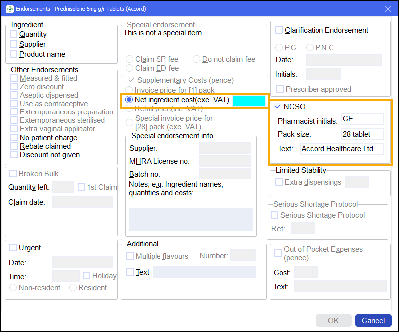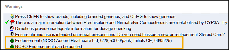 In the image above, the lower prompt alerts you that NCSO endorsements can be applied. The other prompt summarises what will be automatically appended, as the printed endorsement or as part of the electronic claim, if you do not make any manual override.