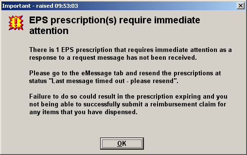 On rare occasions you may submit a claim which is not acknowledged by the NHS Spine. On start-up, Pharmacy Manager informs you if an acknowledgement is not received: